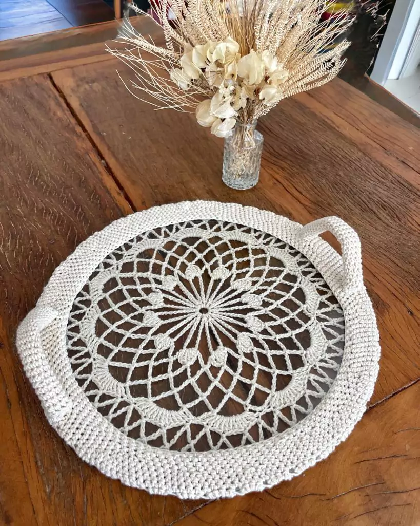 Bandeja redonda em crochê com detalhes no centro e com alça para uma melhor acabamento.