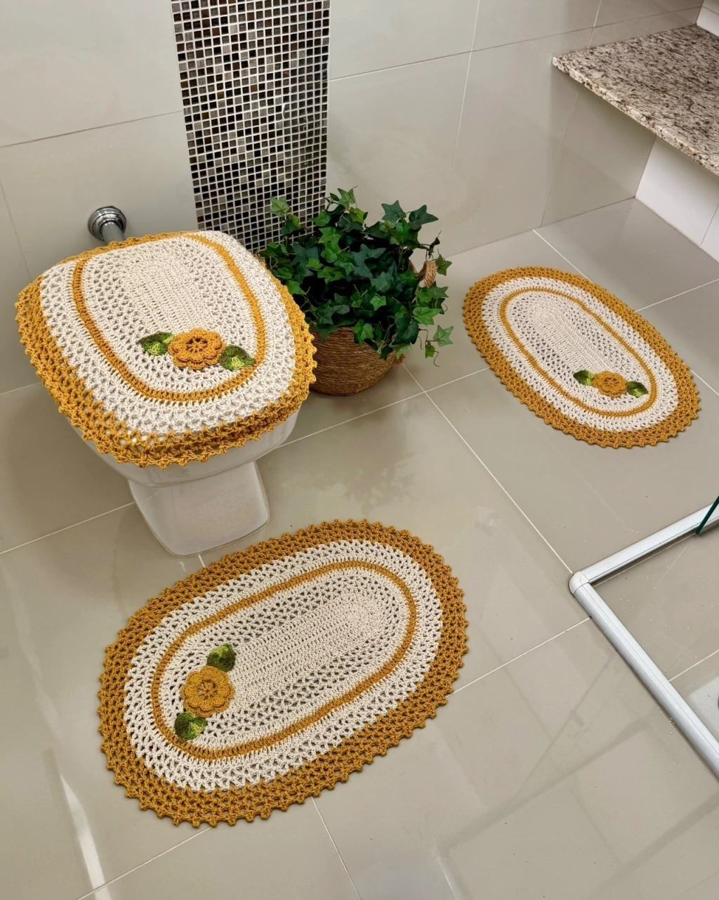 Transforme o visual do seu banheiro com este jogo de banheiro em crochê artesanal, feito em barbante cru com detalhe colorido e aplicação manual de flores. Com design delicado e acabamento sofisticado, ele une charme, conforto e exclusividade para deixar seu ambiente mais acolhedor e elegante.
